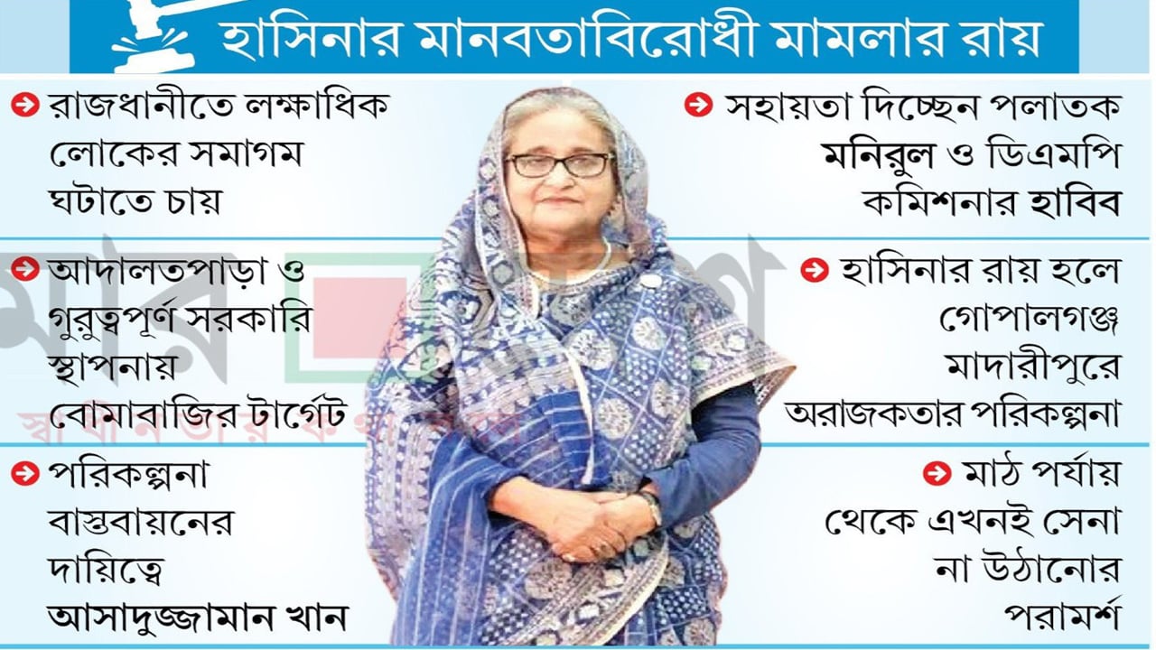 ক্ষমতাচ্যুত প্রধানমন্ত্রী শেখ হাসিনার বিরুদ্ধে আন্তর্জাতিক অপরাধ ট্রাইব্যুনালে করা গণহত্যা মামলার রায় কবে হবে, তা জানা যাবে ১৩ নভেম্বর। ওইদিনকে কেন্দ্র করে বড় ধরনের নাশকতা ও বিশৃঙ্খলার নীলনকশা এঁকেছে তার দল কার্যক্রমনিষিদ্ধ আওয়ামী লীগ। তাদের লক্ষ্য, সহিংস পরিস্থিতি তৈরি করে বিচারপ্রক্রিয়া বাধাগ্রস্ত করা। এ পরিকল্পনার সমন্বয় করা হচ্ছে প্রতিবেশী দেশ ভারত থেকে।