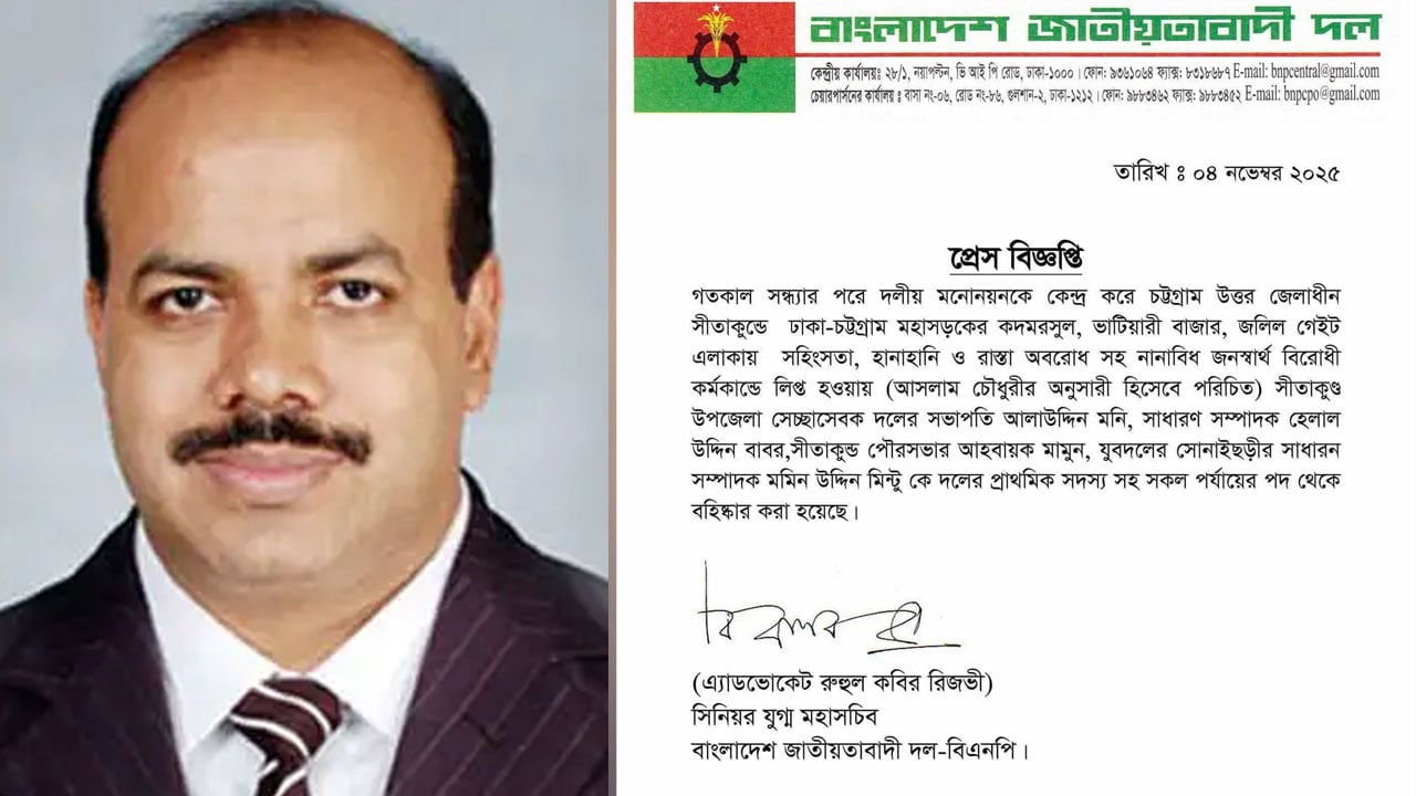 এতে বলা হয়, গতকাল সোমবার সন্ধ্যার পরে দলীয় মনোনয়নকে কেন্দ্র করে চট্টগ্রাম উত্তর জেলাধীন সীতাকুণ্ডে ঢাকা-চট্রগ্রাম মহাসড়কের কদম রসুল, ভাটিয়ারী, বানুর বাজার, জলিল গেইট এলাকায় সহিংসতা, হানাহানি, রাস্তা অবরোধসহ নানাবিধ জনস্বার্থ বিরোধী কাজে লিপ্ত হওয়ায় আসলাম চৌধুরীর অনুসারী হিসেবে পরিচিত সীতাকুণ্ড উপজেলা স্বেচ্ছাসেবক দলের সভাপতি আলাউদ্দিন মনি, সাধারণ সম্পাদক হেলাল উদ্দিন বাবর, পৌরসভা স্বেচ্ছাসেবক দলের আহ্বায়ক মামুন রেজা চৌধুরী, সোনাইছড়ি যুবদলের সাধারণ সম্পাদক মমিন উদ্দিন মিন্টুকে দলের প্রাথমিক সদস্য পদসহ সকল পর্যায়ের পদ থেকে বহিস্কার করা হয়েছে।