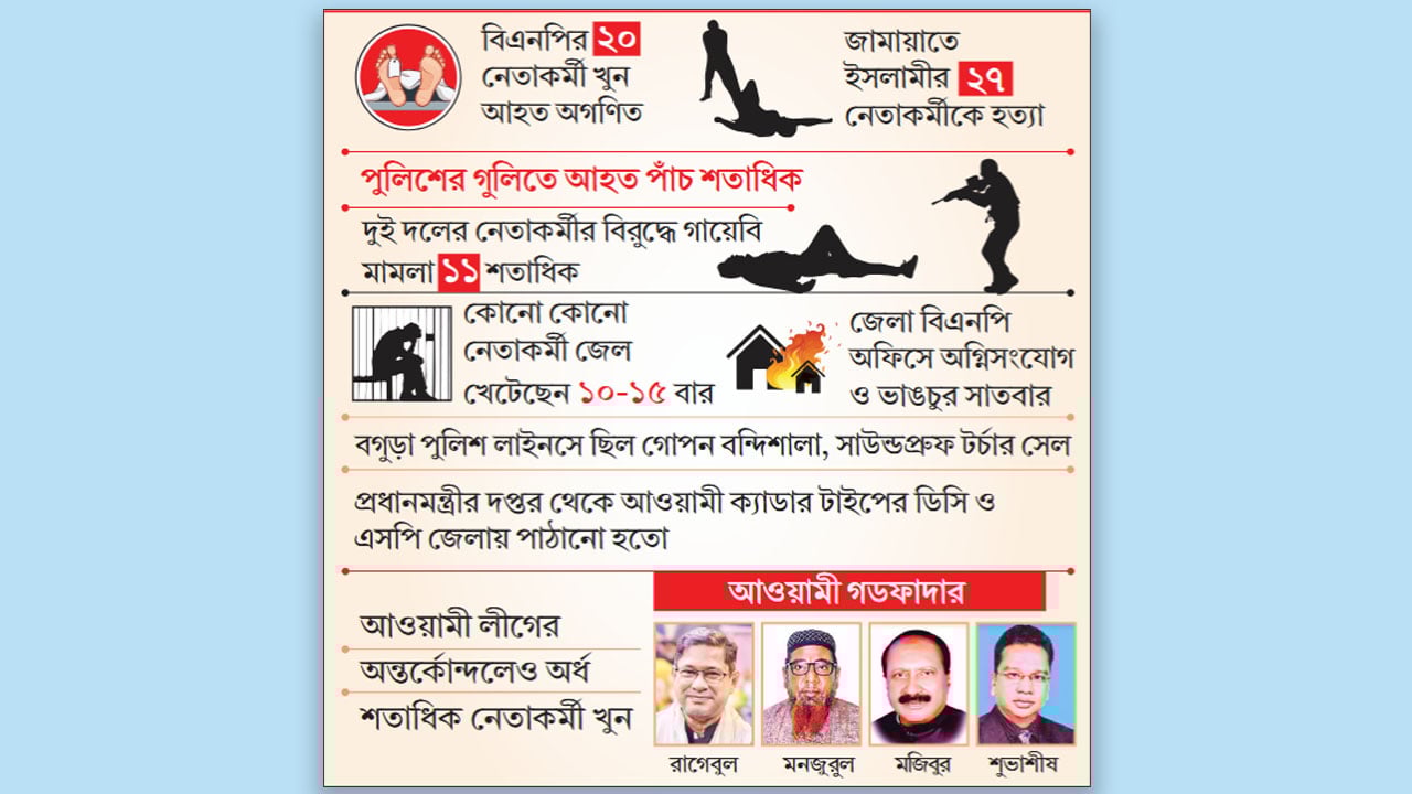 বগুড়ার ১২টি উপজেলায়ই আওয়ামী নির্যাতন ছিল একই রকম। বিরোধী দলের নেতাকর্মীরা রাতে বাড়িতে শান্তিতে ঘরে ঘুমাতে পারেনি। বগুড়ার সব আসনে আওয়ামী লীগের নেতারা প্রহসনের ভোটে সংসদ সদস্য নির্বাচিত হয়ে প্রশাসন দিয়ে নির্যাতন চালায়। তাদের সহযোগী ছিল আওয়ামী লীগ, যুবলীগ, স্বেচ্ছাসেবক লীগ, ছাত্রলীগ এবং অঙ্গ সংগঠনের ক্যাডাররা। আওয়ামী লীগ এতটাই সহিংস হয়ে ওঠে যে, তাদের নিজেদের সংঘাতেও অর্ধ শতাধিক নেতাকর্মী খুন হয়। এদিকে বিগত জুলাই আন্দোলনের সময় বগুড়ায় ১৯ জন শহীদ হয়েছে।