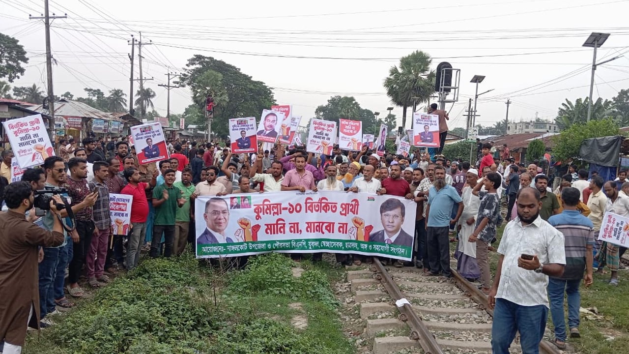 বিএনপির কেন্দ্রীয় নির্বাহী কমিটির সদস্য মোবাশ্বের আলম ভূঁইয়াকে কুমিল্লা-১০ (নাঙ্গলকোট–লালমাই) আসনে মনোনয়ন না দেওয়ায় তার কর্মী ও সমর্থকরা রেল লাইনে আগুন জ্বালিয়ে বিক্ষোভ ও অবরোধ করে।