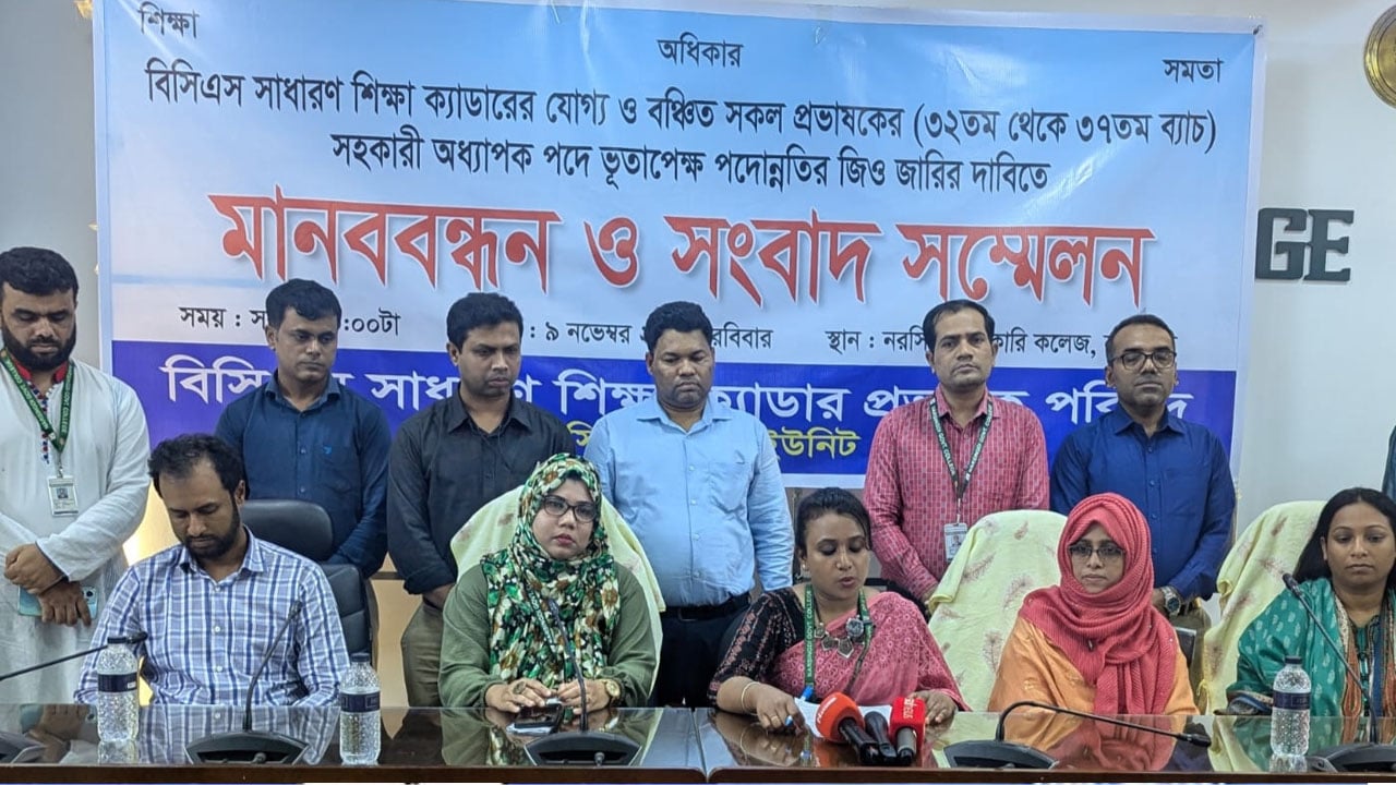 নরসিংদীতে মানববন্ধন ও সংবাদ সম্মেলন করেছেন পদোন্নতি বঞ্চিত তিন সরকারি কলেজের শিক্ষা ক্যাডাররা। রোববার বেলা ১১টার দিকে নরসিংদী সরকারি কলেজের শহীদ মিনার প্রাঙ্গণে অনুষ্ঠিত মানববন্ধনে অর্ধশত বিসিএস সাধারণ শিক্ষা ক্যাডাররা অংশ নেন।