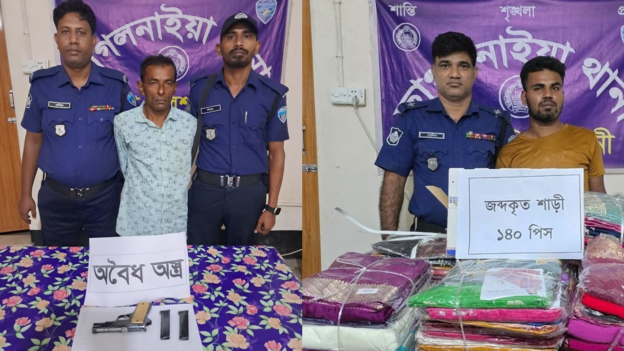 ফেনীর ছাগলনাইয়ায় যৌথবাহিনীর পৃথক অভিযানে ১টি বিদেশি পিস্তল, ২টি ম্যাগাজিন, এবং ১৪০টি ভারতীয় শাড়ি উদ্ধার করা হয়েছে।