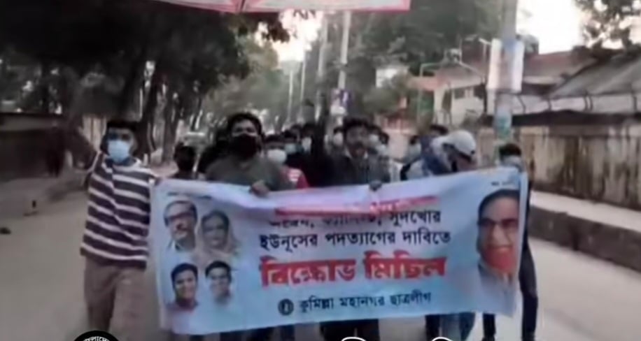 কুমিল্লা পুলিশ সুপারের কার্যালয় ও কোতোয়ালি থানা পুলিশের নাকের ডগায় মিছিল করেছে নিষিদ্ধ ঘোষিত সংগঠন ছাত্রলীগ। গতকাল বৃহস্পতিবার সকালে কুমিল্লা কেন্দ্রীয় ঈদগাহসংলগ্ন সড়কে মিছিল বের করে তারা। ৪৯ সেকেন্ডের একটি ভিডিও সামাজিক যোগাযোগমাধ্যমে ভাইরাল হয়েছে।