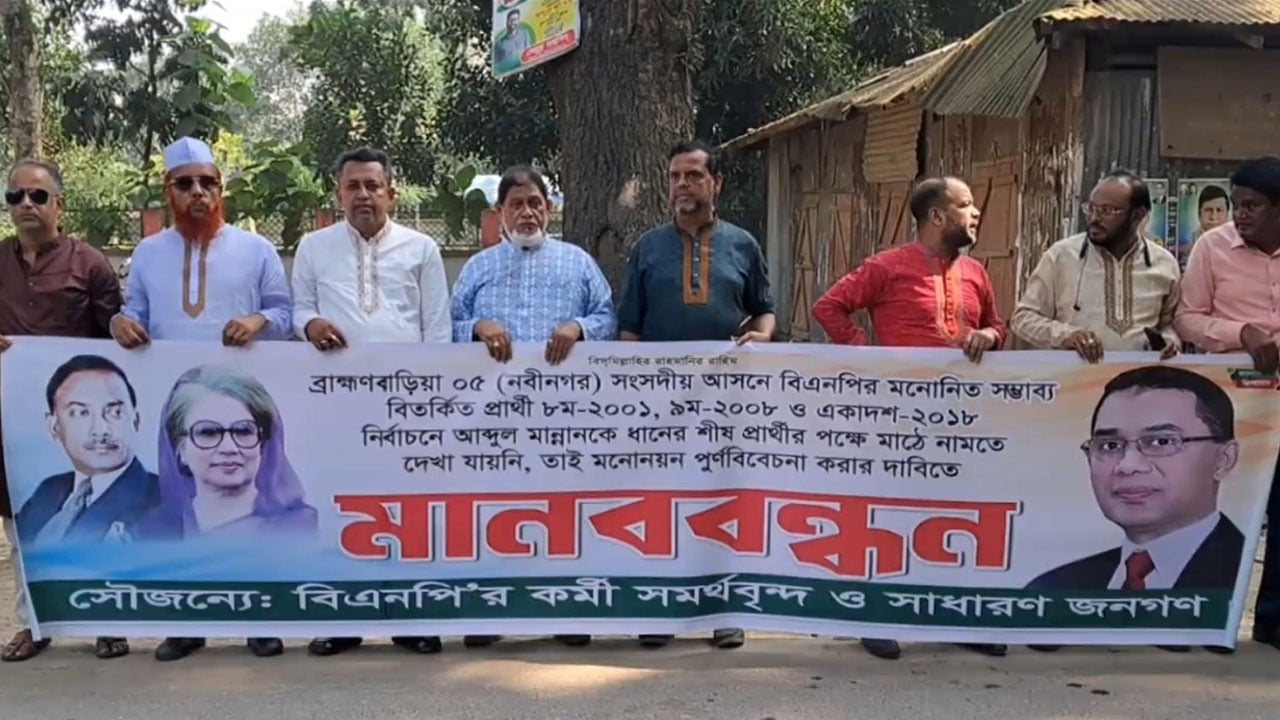 ব্রাহ্মণবাড়িয়া-৫ (নবীনগর) আসনে বিএনপির মনোনীত প্রার্থী পরিবর্তনের দাবিতে মানববন্ধন ও বিক্ষোভ করেছেন নেতাকর্মীরা। রোববার দুপুরে নবীনগর-কোম্পানীগঞ্জ সড়কে আলীয়াবাদ থেকে শুরু করে বাঙ্গরা বাজার পর্যন্ত এ কর্মসূচি পালন করা হয়। এতে অংশ নেন জেলা বিএনপির অর্থনৈতিক বিষয়ক সম্পাদক কাজী নাজমুল হোসেন তাপসের সমর্থ