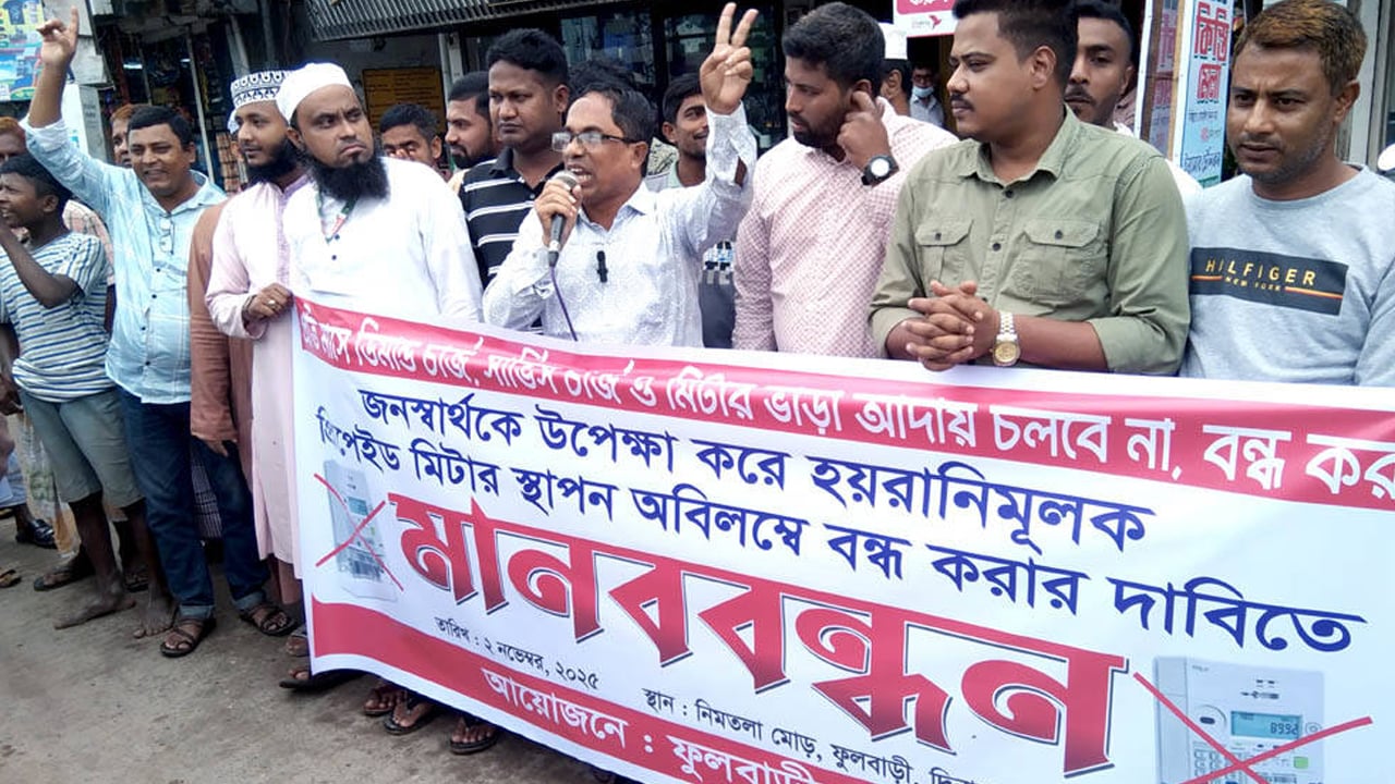 মানববন্ধনে প্রি-পেইড মিটার স্থাপন প্রকল্প বাতিলের ৪৮ ঘণ্টার আল্টিমেটাম দেওয়া হয়। মানববন্ধন শেষে উপজেলা নির্বাহী কর্মকর্তার বরাবর প্রকল্পটি বন্ধের দাবিতে একটি স্মারকলিপি প্রদান করা হয়।