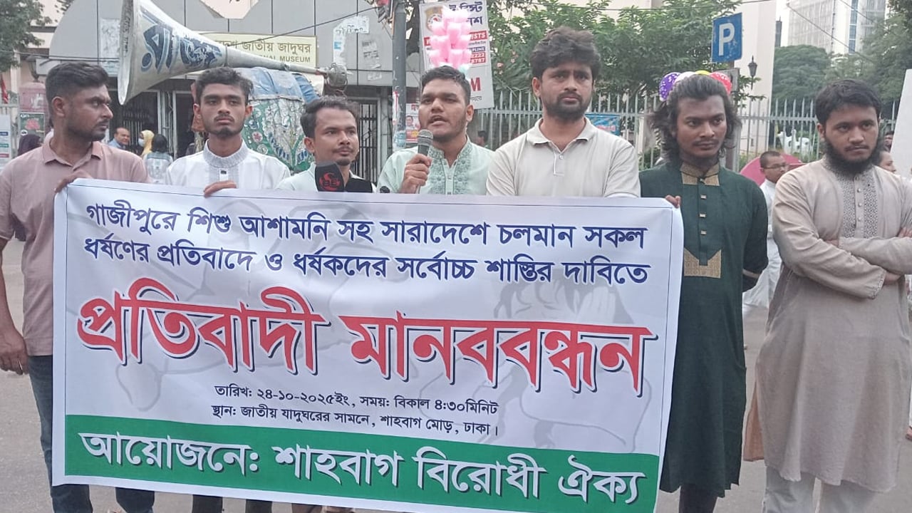 শুক্রবার বিকালে শাহবাগ মোড়ে জাতীয় জাদুঘরের সামনে এক মানববন্ধনে বক্তারা এসব দাবি করেন।