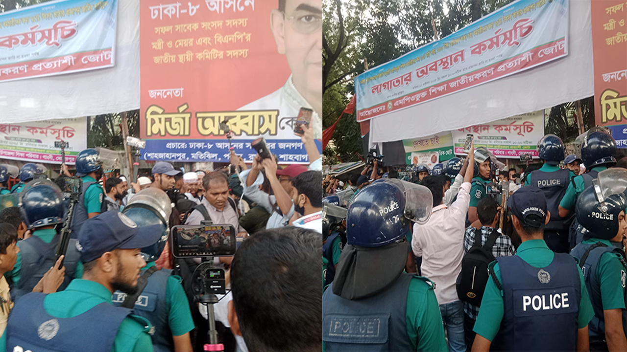 বিভিন্ন দাবিতে জাতীয় প্রেসক্লাবের সামনের সড়কে অবস্থারত শিক্ষকদের ওপর অ্যাকশনে গেছে পুলিশ। রোববার সকাল থেকে রাস্তা অবরোধ করে অবস্থানের এক পর্যায়ে দুপুর পৌনে দুইটার দিকে তাদেরকে সরিয়ে দিতে লাঠিচার্জ, সাউন্ড গ্রেনেড ও টিয়ার শেল নিক্ষেপ করে পুলিশ। শিক্ষকদেরকে ধাওয়া দিয়ে কেন্দ্রীয় শহীদ মিনারের নিয়ে যায়।