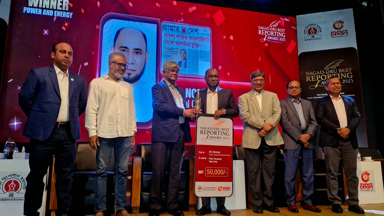 ঢাকা রিপোর্টার্স ইউনিটির (ডিআরইউ) বেস্ট রিপোর্টিং অ্যাওয়ার্ড পেয়েছেন আমার দেশের বিশেষ প্রতিনিধি এম এ নোমান। ‘অদৃশ্য শক্তির কারসাজিতে বহাল আদানির চুক্তি’ শিরোনামের প্রতিবেদনের জন্য তিনি এ পুরস্কার পান।