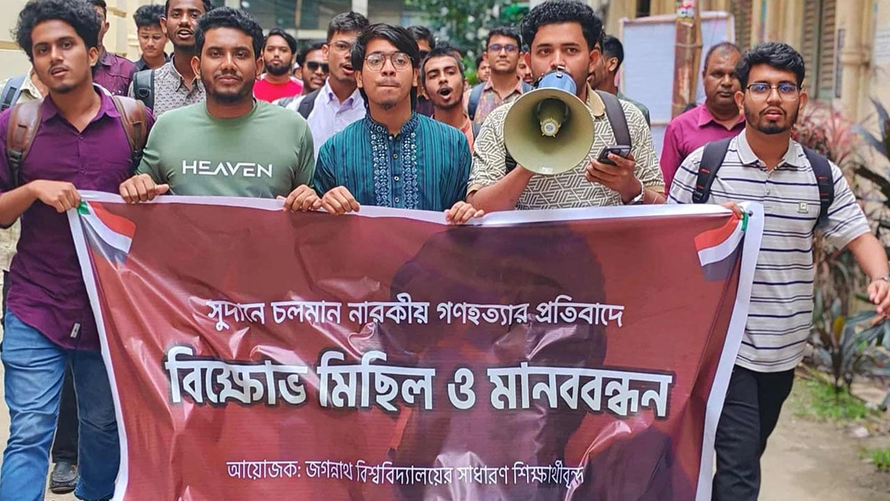 সুদানে চলমান গণহত্যার প্রতিবাদে বিক্ষোভ মিছিল ও মানববন্ধন করেছে জগন্নাথ বিশ্ববিদ্যালয়ের সাধারণ শিক্ষার্থীরা। রোববার বিশ্ববিদ্যালয়ের কেন্দ্রীয় মসজিদের সামনে থেকে বিক্ষোভ মিছিলটি শুরু হয়ে শহিদ মিনার, ভাষা শহিদ রফিক ভবন ও বিজ্ঞান অনুষদ ঘুরে গুচ্ছ ভাস্কর্য চত্বরে গিয়ে শেষ হয়। পরে সেখানে অনুষ্ঠিত হয় মান