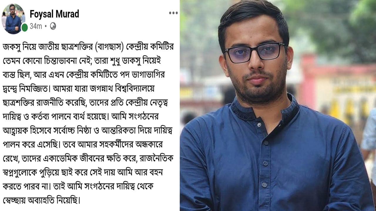 জাতীয় কেন্দ্রীয় নেতৃত্বের ব্যর্থতার অভিযোগ তুলে পদত্যাগের ঘোষণা দিয়ে ফেসবুকে পোস্ট দিয়েছিলেন জগন্নাথ বিশ্ববিদ্যালয় (জবি) শাখা জাতীয় ছাত্রশক্তির আহ্বায়ক ফয়সাল মুরাদ। তবে কিছুক্ষণ পরই পোস্টটি নিজের টাইমলাইন থেকে মুছে ফেলেন তিনি।