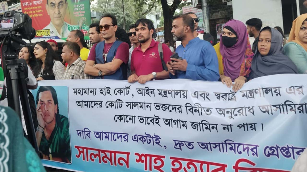 ব্যানার, পোস্টার ও সালমান শাহর ছবি নিয়ে দেশের বিভিন্ন জেলা থেকে আগত শত শত সালমান ভক্ত ও শুভানুধ্যায়ীদের স্লোগানে পুরো প্রেস ক্লাব এলাকা যেন পরিণত হয় এক শোকাভিভূত প্রতিবাদের মিছিলে। কেউ সালমান শাহের ছবি নিয়ে, কেউ প্ল্যাকার্ড নিয়ে, কেউ ভিউকার্ড নিয়ে আর কেউবা নিজেই সালমান শাহ সেজে এসেছেন মানববন্ধনে।