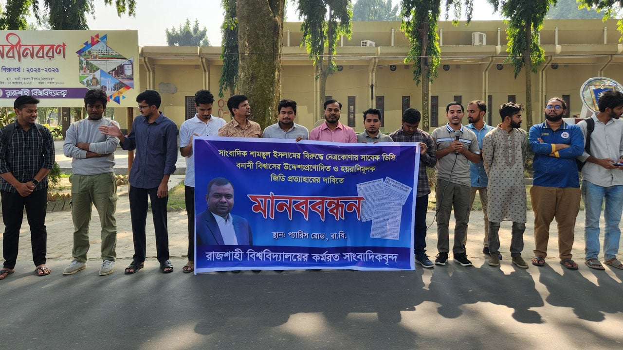 সাংবাদিক শামছুর ইসলামের বিরুদ্ধে নেতকোণার সাবেক ডিসি বনানী বিশ্বাসের উদ্দেশ্যপ্রণোদিত ও হয়রানিমূলক জিডি পত্যাহারের দাবিতে মানববন্ধন করেছে রাজশাহী বিশ্ববিদ্যালয়ের কর্মরত সাংবাদিকরা।