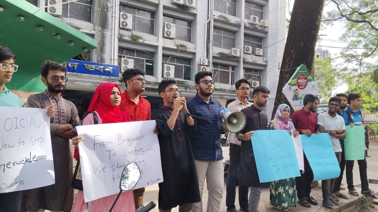 রোববার (২ নভেম্বর) বিশ্ববিদ্যালয়ের ভাস্কর্য চত্বরে আয়োজিত মানববন্ধনে সংগঠনটির মানবাধিকার কর্মীরা গণহত্যা বন্ধ ও শান্তি প্রতিষ্ঠার জন্য বৈশ্বিক সম্প্রদায়ের প্রতি আহ্বান জানান।