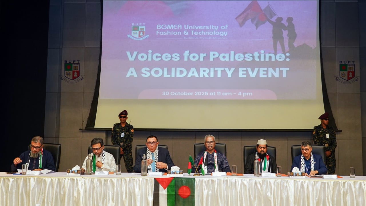 বিজিএমইএ ইউনিভার্সিটি অব ফ্যাশন অ্যান্ড টেকনোলজি (বিইউএফটি) প্যালেস্টাইনের প্রতি সংহতি জানাতে এবং তাদের চলমান মানবিক সংগ্রাম সম্পর্কে সচেতনতা বৃদ্ধির লক্ষ্যে “ভয়েসেস ফর প্যালেস্টাইন: এ সলিডারিটি ইভেন্ট” শিরোনামে ৩০ অক্টোবর ২০২৫ তারিখে বিশ্ববিদ্যালয়ের স্থায়ী ক্যাম্পাস অডিটোরিয়ামে দিনব্যাপী অনুষ্ঠান আ