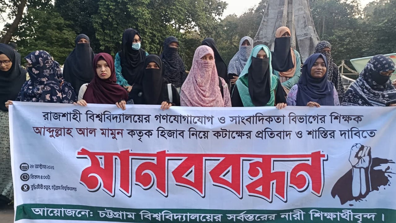 রাজশাহী বিশ্ববিদ্যালয়ের গণযোগাযোগ ও সাংবাদিকতা বিভাগের শিক্ষক আবদুল্লাহ আল মামুন কর্তৃক হিজাব নিয়ে কটাক্ষের প্রতিবাদ ও তার বিচারের দাবিতে চট্টগ্রাম বিশ্ববিদ্যালয়ে মানববন্ধন হয়েছে।