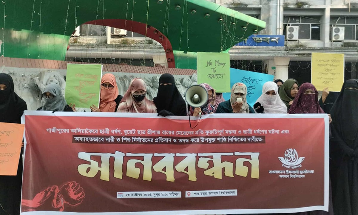 ২৮ মিনিট আগেগাজীপুরের কালিয়াকৈরে ছাত্রী ধর্ষণ এবং বুয়েট ছাত্র শ্রীশান্ত রায়ের মেয়েদের প্রতি কুরুচিপূর্ণ মন্তব্য ও ধর্ষণের ঘটনার প্রতিবাদে মানববন্ধন করেছে জগন্নাথ বিশ্ববিদ্যালয় (জবি) ছাত্রী সংস্থা।