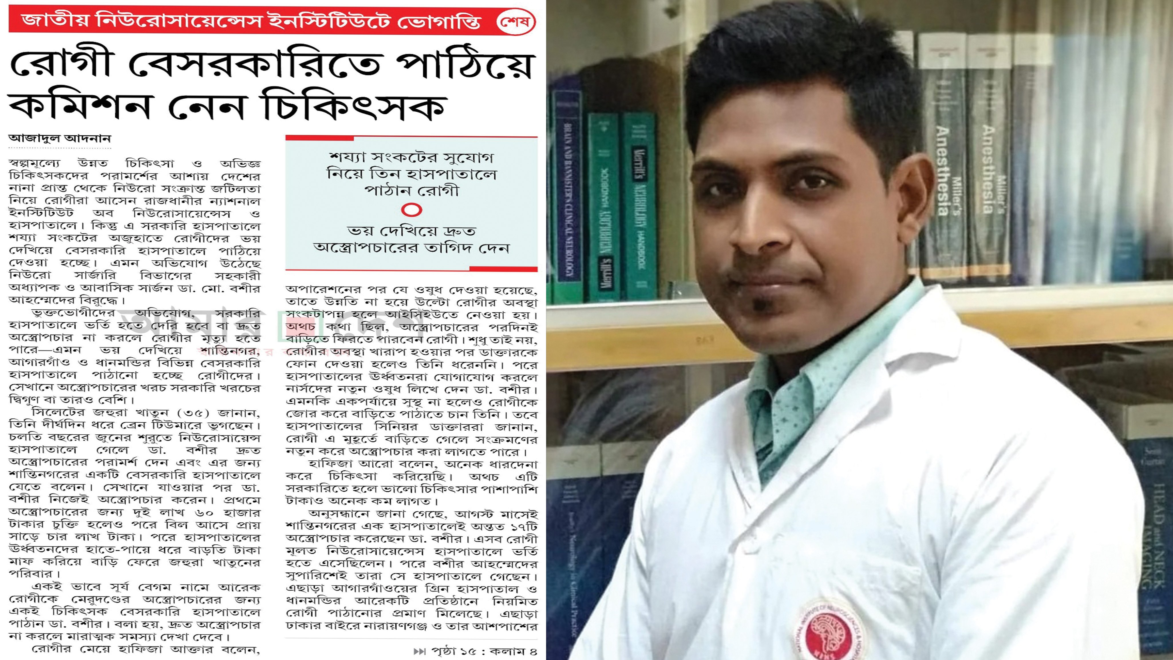 প্রকাশিত সংবাদে বলা হয়, স্বল্পমূল্যে উন্নত চিকিৎসা ও অভিজ্ঞ চিকিৎসকদের পরামর্শের আশায় দেশের নানা প্রান্ত থেকে নিউরো সংক্রান্ত জটিলতা নিয়ে রোগীরা আসেন রাজধানীর ন্যাশনাল ইনস্টিটিউট অব নিউরোসায়েন্সেস ও হাসপাতালে। কিন্তু এ সরকারি হাসপাতালে শয্যা সংকটের অজুহাতে রোগীদের ভয় দেখিয়ে বেসরকারি হাসপাতালে পাঠিয়ে দেন প্রতিষ্ঠানটির নিউরো সার্জারি বিভাগের সহকারী অধ্যাপক ও আবাসিক সার্জন ডা. মো. বশীর আহম্মেদ।