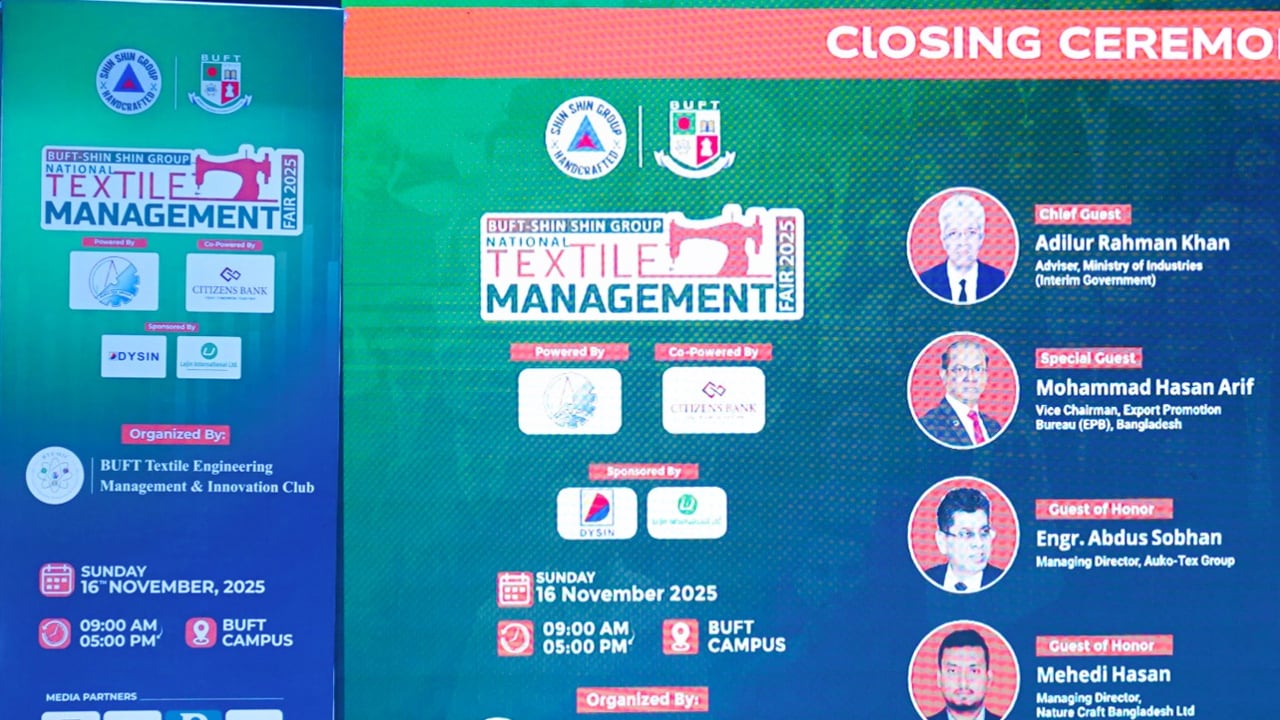 বিজিএমইএ ইউনিভার্সিটি অব ফ্যাশন অ্যান্ড টেকনোলজি (বিইউএফটি), বিশ্ববিদ্যালয়ের টেক্সটাইল ইঞ্জিনিয়ারিং ম্যানেজমেন্ট অ্যান্ড ইনোভেশন ক্লাবের ব্যবস্থাপনায় ১৬ নভেম্বর ২০২৫ তারিখ আয়োজন করে শিন শিন গ্রুপ প্রেজেন্টস ন্যাশনাল টেক্সটাইল ম্যানেজমেন্ট ফেয়ার ২০২৫।