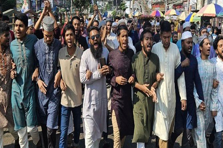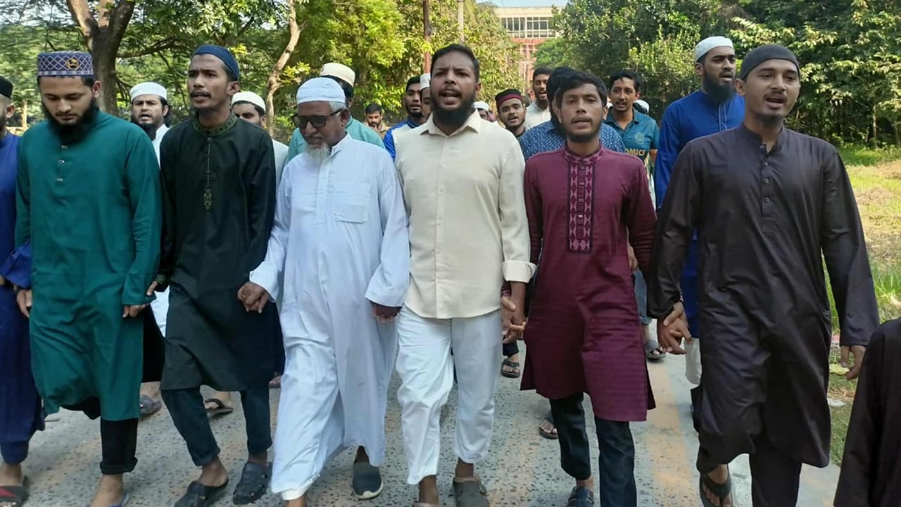 দেশজুড়ে চলমান সহিংসতা, গাজীপুরে মসজিদের ইমাম অপহরণ ও ধর্ষণের ঘটনার প্রতিবাদে এবং অভিযুক্তদের দ্রুত বিচার এবং বাংলাদেশে উগ্র হিন্দুত্ববাদী সংগঠন ইসকন নিষিদ্ধের দাবিতে বিক্ষোভ মিছিল করেছে ঢাকা কলেজের শিক্ষার্থীরা।