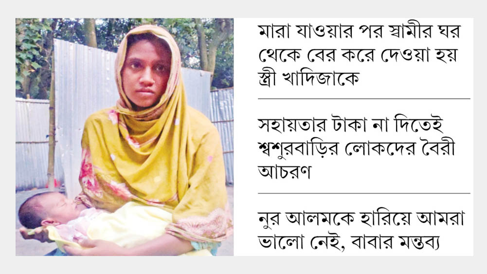 এসব কথা বলতে বলতে অজানা এক আশঙ্কার মাঝে হারিয়ে যান খাদিজা। তার চোখ ছলছল করছিল। খাদিজা বলেন, ‘স্বামী হারানোর শোক যে কী, যার হারাইছে সে-ই জানে। এতকিছুর মাঝে আমি আরও বড় আঘাত পেয়েছি নুর আলমের মারা যাওয়ার ৪৪ দিনের মাথায় আমার শ্বশুর-শাশুড়ি আমাকে বিনা কারণে স্বামীর ঘর থেকে বের করে দিয়েছে।