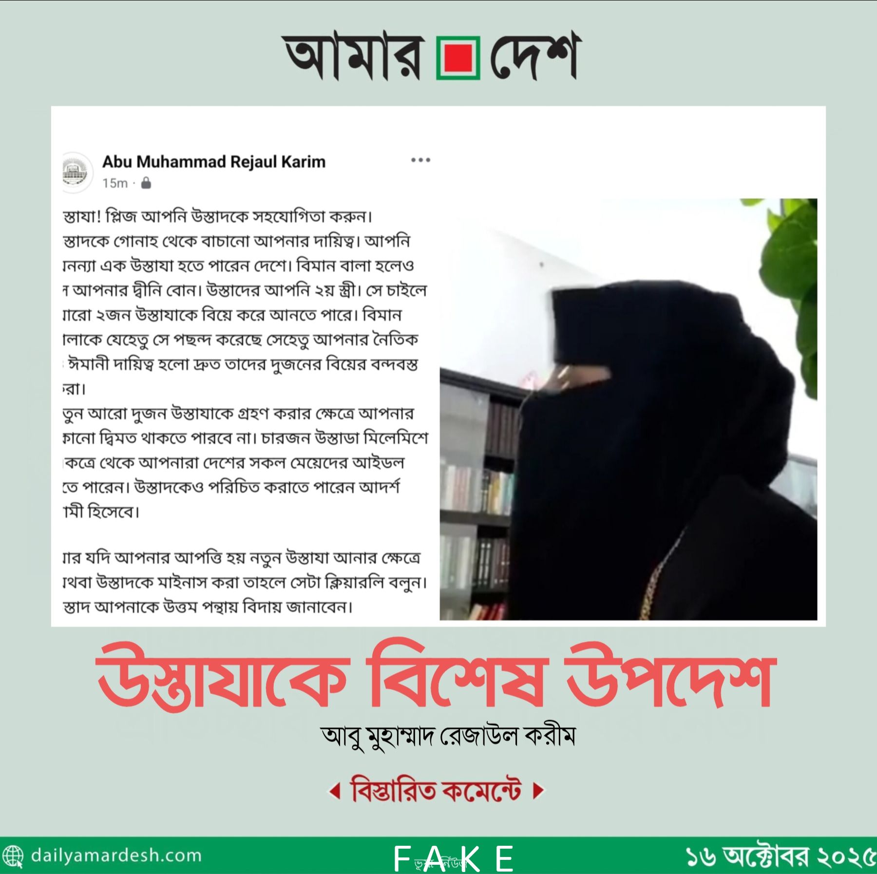 সম্প্রতি সামাজিক যোগাযোগমাধ্যমে দেখা যাচ্ছে বিভিন্ন ফেসবুক আইডিতে আমার দেশের ভুয়া ফটোকার্ড ব্যবহার করে এ প্রচারণা চালানো হচ্ছে। আমার দেশ অনলাইন টিমের পক্ষ থেকে জানানো হয়েছে- আবু ত্বহার স্ত্রীর লেখা ও ছবি সংযুক্ত ওই ফটোকার্ডটি আমার দেশ কখনই তৈরি করেনি ও প্রচারণায় যুক্ত নয়।