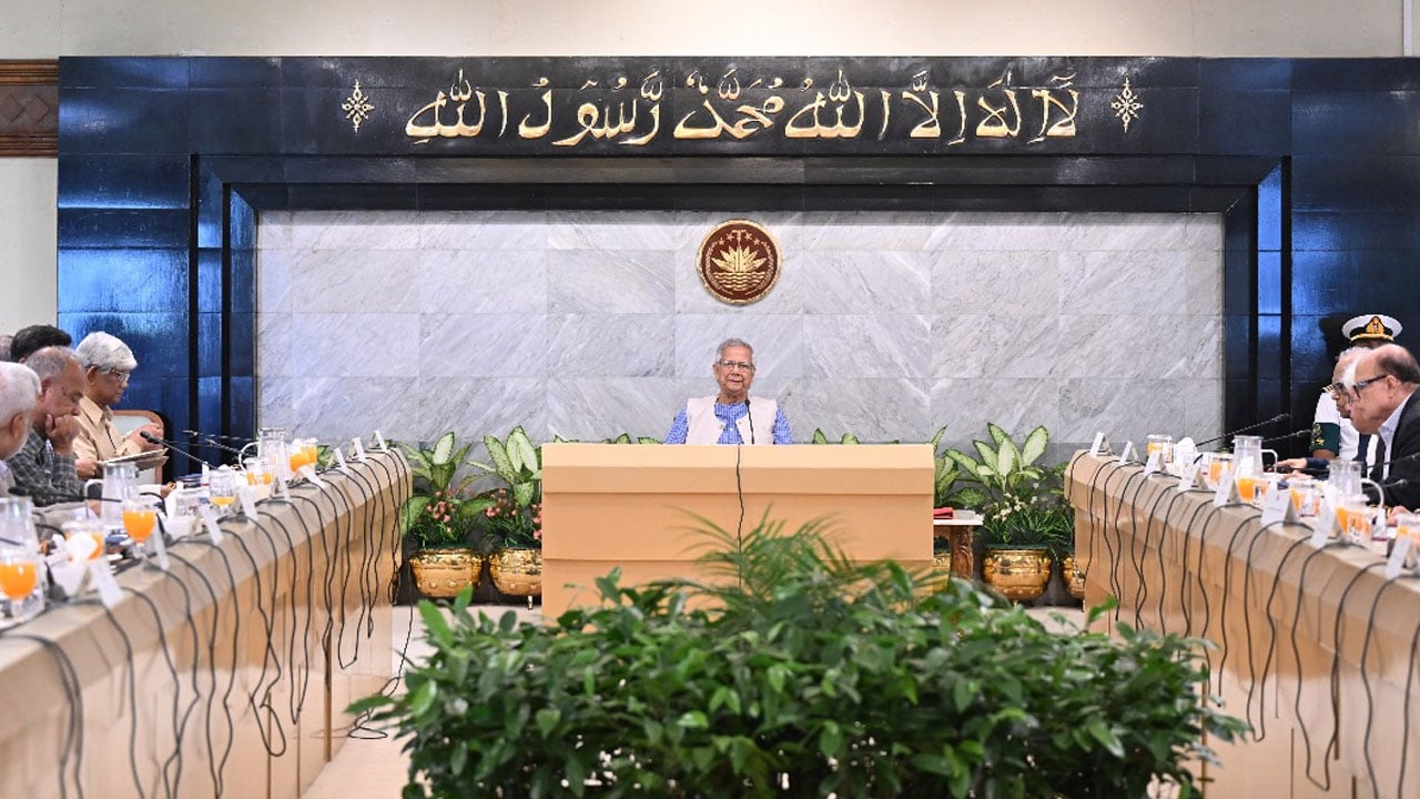 ড. ইউনূসের সভাপতিত্বে বৈঠকে বসেছেন অন্তর্বর্তী সরকারের উপদেষ্টা পরিষদ। রাজধানীর তেজগাঁওয়ে প্রধান উপদেষ্টার কার্যালয়ে এই বৈঠক শুরু হয়েছে। বৈঠক শেষে বৃহস্পতিবার দুপুরে জাতির উদ্দেশে ভাষণ দেয়ার কথা রয়েছে প্রধান উপদেষ্টার।