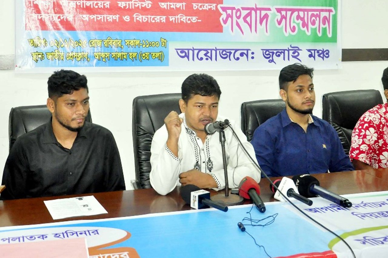 রোববার জাতীয় প্রেসক্লাবের আবদুস সালাম হলে সুনির্দিষ্টভাবে অভিযুক্ত ৪৪ জন সচিব এবং ৯৫ জন ম্যাজিস্ট্রেট এর গ্রেপ্তারপূর্বক বিচার এবং শিক্ষা মন্ত্রণালয়ের ফ্যাসিস্ট আমলা চক্রের সদস্যদের অপসারণ ও বিচারের দাবিতে জুলাই মঞ্চ আয়োজিত সংবাদ সম্মেলনে একথা বলেন তিনি।