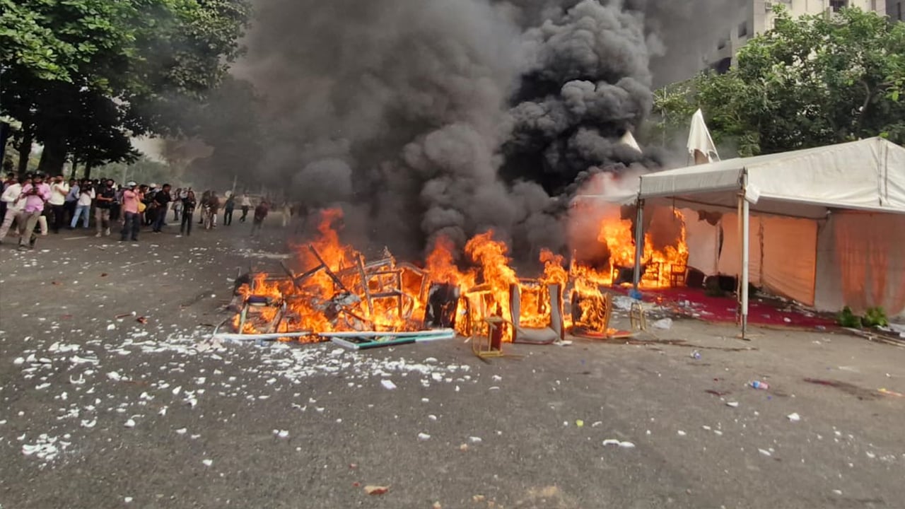 জুলাই সনদ স্বাক্ষর অনুষ্ঠানকে কেন্দ্র করে মানিক মিয়া এভিনিউয়ে সেচ ভবনের সামনে তৈরি করা অস্থায়ী তাঁবুতেও আগুন ধরিয়ে দিয়েছেন আন্দোলনকারীরা। দুপুর ২টার দিকে এ ঘটনা ঘটে। আন্দোলনকারীদের মানিক মিয়া এভিনিউ থেকে সরিয়ে দিয়েছে আইনশৃঙ্খলা রক্ষাকারী বাহিনীর সদস্যরা। পরিস্থিতি এখন থমথমে রয়েছে।