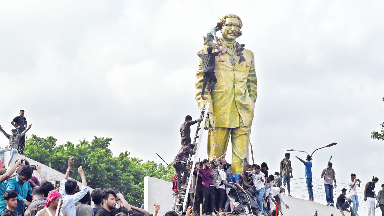 হাসিনা ভারতে পালিয়ে যাওয়ার অল্প সময় পরই উদ্যাপনকারীদের একটি অংশ মবে পরিণত হয়। এই মবের দাঙ্গাকারীরা আওয়ামী লীগের দলীয় অফিস এবং হাসিনার পরিবারের রাজনৈতিক উত্তরাধিকারের সব প্রতীকে হামলা চালায়। এর মধ্যে হাসিনার বাবা শেখ মুজিবুর রহমানের ভাস্কর্য ও তার স্মৃতি জাদুঘরও রয়েছে।