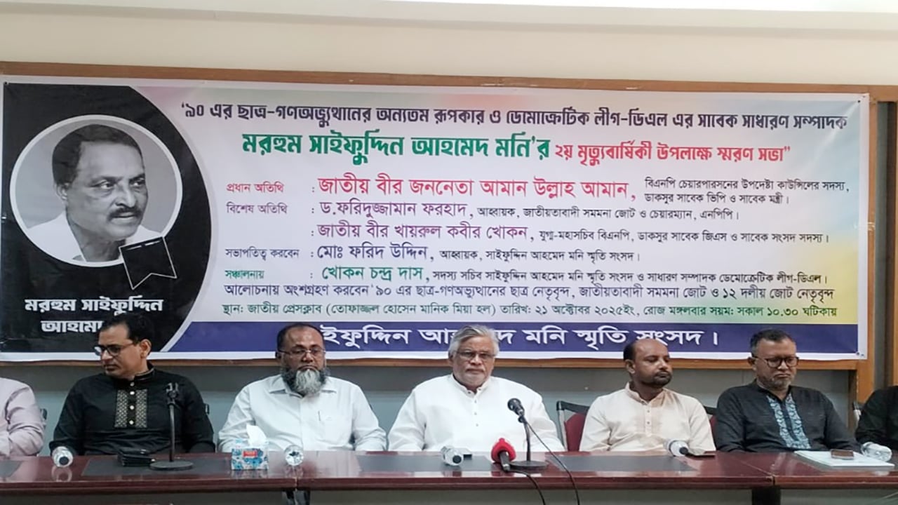 মঙ্গলবার সকালে জাতীয় প্রেসক্লাবে ৯০'র ছাত্র- গণঅভ্যুত্থানের অন্যতম রুপকার ডেমাক্রেটিক লীগ-ডিএল এর সাবেক সাধারণ সম্পাদক সাইফুদ্দিন আহমেদ মনির ২য় মৃত্যুবার্ষিকী উপলক্ষে আয়োজিত স্মরণ সভায় তিনি একথা বলেন।
