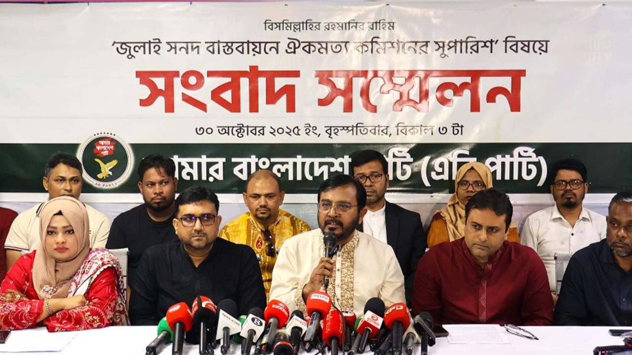 জুলাই জাতীয় সনদ বাস্তবায়নে ঐকমত্য কমিশনের সুপারিশ’ নিয়ে আয়োজিত সংবাদ সম্মেলনে আমার বাংলাদেশ পার্টি’র (এবি পার্টি) পক্ষ থেকে আবারো বিবাদমান পক্ষগুলোকে অহমিকা এবং তর্ক-বিতর্ক পরিহার করে ‘জুলাই জাতীয় সনদ বাস্তবায়ন আদেশ’ কার্যকরে একমত হওয়ার আহ্বান জানানো হয়েছে।