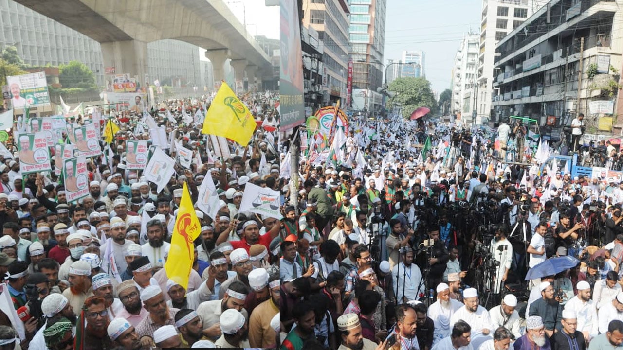 জুলাই সনদ বাস্তবায়ন আদেশ জারি ও নভেম্বরে গণভোট অনুষ্ঠানসহ পাঁচ দফা দাবিতে রাজধানীর পল্টন মোড়ে জামায়াতে ইসলামী ও সমমনা আট দলের সমাবেশ শুরু হয়েছে।