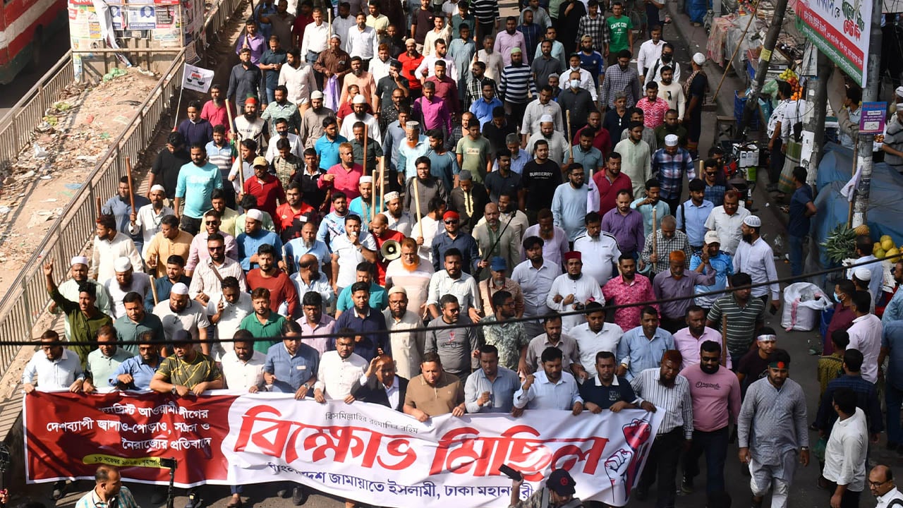 এদিকে জামায়াতে ইসলামী ঢাকা মহানগরী দক্ষিণের উদ্যোগে বৃহস্পতিবার সকাল সাড়ে ৮টায় ফ্যাসিস্ট আওয়ামী লীগের জ্বালাও-পোড়াও, সন্ত্রাস, নৈরাজ্যের প্রতিবাদে বায়তুল মোকাররম জাতীয় মসজিদের উত্তর গেটে বিক্ষোভ সমবেশ অনুষ্ঠিত হয়। সেখান থেকে মিছিল বের করা হয়। এছাড়া রাজধানীর বিভিন্ন এলাকায় মিছিল ও সমাবেশ করবে জামায়াত।