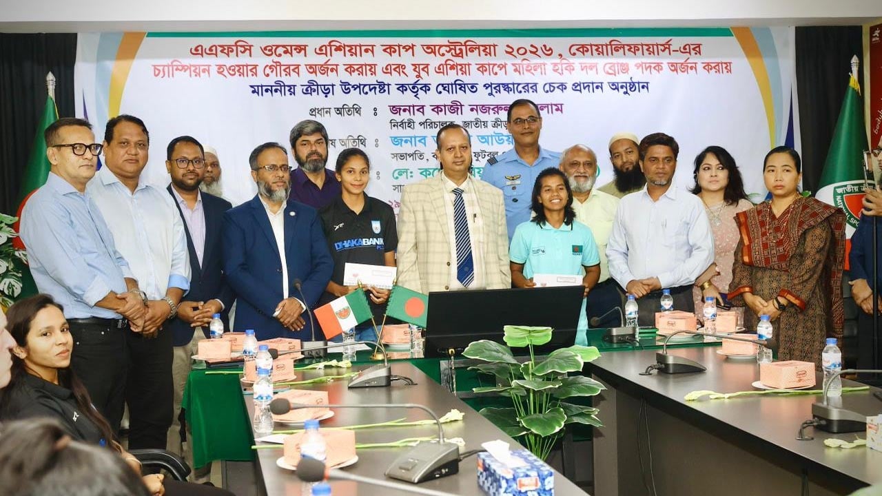 প্রথমবারের মতো এশিয়ান কাপের মূল পর্বে কোয়ালিফাই করার পর নারী ফুটবল দলের জন্য ৫০ লাখ টাকা পুরস্কার ঘোষণা করেছিলেন যুব ও ক্রীড়া উপদেষ্টা আসিফ মাহমুদ সজীব ভূঁইয়া। একই সময়ে চীনে অনুষ্ঠিত অনূর্ধ্ব-১৮ এশিয়া কাপ হকির নারী বিভাগে প্রথম ব্রোঞ্জপদক জেতে বাংলাদেশ। পদকজয়ী নারী হকি দলের জন্য ২১ লাখ টাকার পুরস্কার ঘোষণা করা হয়। আজ প্রতিশ্রুত আর্থিক পুরস্কার বুঝে পায় নারী ফুটবল ও হকি দল। জাতীয় ক্রীড়া পরিষদের (এনএসসি) সভাকক্ষে এক অনুষ্ঠানের মাধ্যমে দুই দলের খেলোয়াড়, কোচ ও কর্মকর্তাদের হাতে চেক তুলে দেন এনএসসির নির্বাহী পরিচালক কাজী নজরুল ইসলাম।