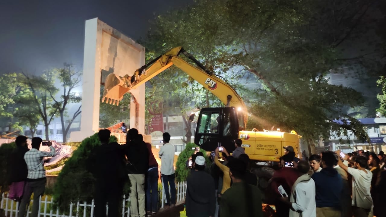 ‘ফ্যাসিবাদের আস্তানা ভেঙ্গে দাও, গুঁড়িয়ে দাও’, ‘ফ্যাসিবাদের আস্তানা বাংলাদেশে হবে না’ শ্লোগানে মুখরিত মিছিল এগিয়ে যায় বন্দর বাজার এলাকায় জেলা প্রশাসকের কার্যালয়ের সামনে। সেখানে বুলডোজার দিয়ে আগে কিছুটা ভেঙে ফেলা শেখ মুজিবুর রহমানের ম্যুরাল পুরোপুরি ভেঙে চুরমার করে দেয়া হচ্ছে।