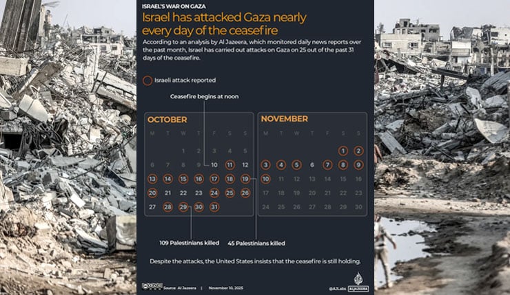 গাজায় যুক্তরাষ্ট্রের প্রেসিডেন্ট ট্রাম্পের মধ্যস্ততায় হওয়া যুদ্ধবিরতির পরও ইসরাইল প্রায় প্রতিদিনই হামলা চালিয়েছে বলে জানিয়েছে আল জাজিরা। সংস্থাটির এক বিশ্লেষণে দেখা গেছে, গত এক মাসে ঘোষিত যুদ্ধবিরতির ৩১ দিনের মধ্যে অন্তত ২৫ দিনই গাজায় ইসরায়েলি হামলার ঘটনা ঘটেছে।
