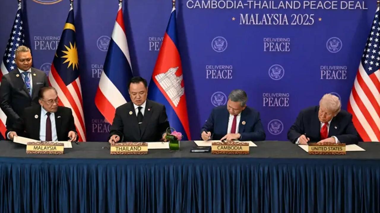 মার্কিন প্রেসিডেন্ট ডোনাল্ড ট্রাম্পের মধ্যস্থতায় শান্তি চুক্তি সই করেছে থাইল্যান্ড ও কম্বোডিয়া।রোববার মালয়েশিয়ায় আসিয়ান শীর্ষ সম্মেলনের ফাঁকে এই চুক্তিতে স্বাক্ষর করেন থাইল্যান্ডের প্রধানমন্ত্রী অনুতিন চার্নভিরাকুল ও কম্বোডিয়ার প্রধানমন্ত্রী হুন মানেত।